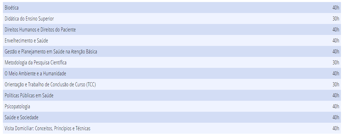 Esse curso objetiva oferecer aspectos sociais e comportamentais da promoção da saúde. Abrange a compreensão dos fatores sociais, psicológicos e ambientais que influenciam saúde, doença e qualidade de vida, bem como nas consequências da condição de saúde do indivíduo e da coletividade. Formar profissionais para o exercício da docência na educação superior através da instrumentalização dos docentes com metodologias, práticas, recursos didáticos e pedagógicos atualizados.