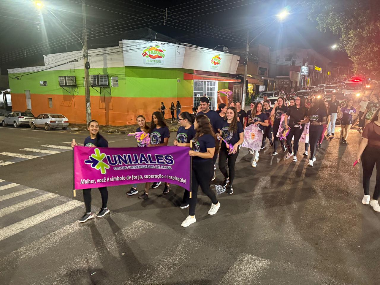 Já tradicional em Jales, a Caminhada das Mulheres reuniu centenas de pessoas em sua quinta edição, realizada na noite desta quarta-feira, 18 de março. O evento, com concentração na Praça João Mariano de Freitas e trajeto pela Avenida Francisco Jalles, faz alusão ao Dia Internacional da Mulher, celebrado em 8 de março. Mais uma vez, o Centro Universitário de Jales esteve presente com professores e alunos de diversos cursos, que desenvolveram atividades voltadas ao bem-estar e ao acolhimento das mulheres. Todas as iniciativas tiveram supervisão de professores responsáveis.